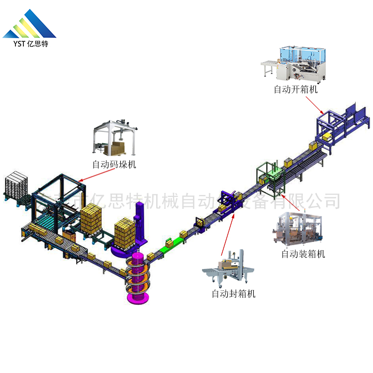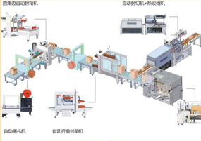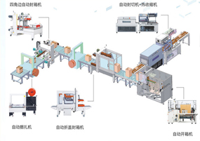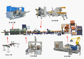 系統(tǒng)組成部分:自動(dòng)開(kāi)箱機(jī)+自動(dòng)裝箱機(jī)+自動(dòng)封箱機(jī)+自動(dòng)碼垛